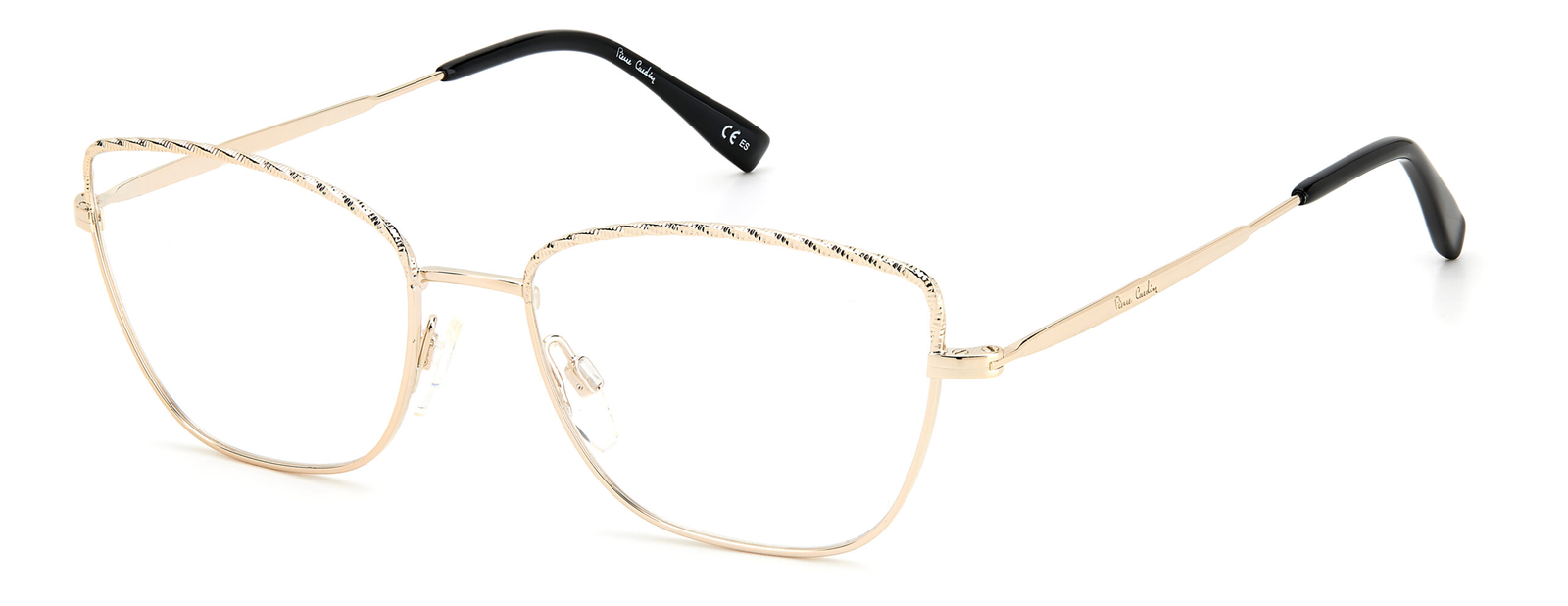 - الأذرع: الأذرع رفيعة ومصنوعة من المعدن الذهبي، وتتصل بأطراف من البلاستيك باللون الأسود لضمان راحة مثالية. يظهر شعار “Pierre Cardin” على الذراع اليمنى، مما يؤكد على هوية العلامة التجارية.